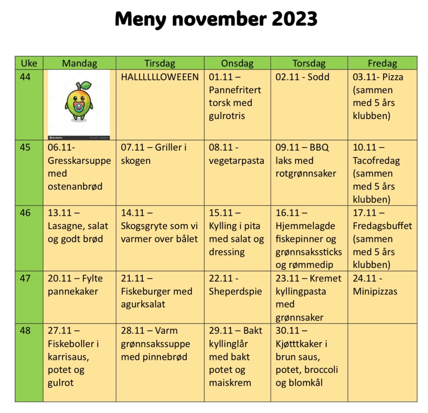 Mat i barnehagen spiller en viktig rolle i barns hverdag og trivsel. Et godt og variert måltid gir ikke bare nødvendig energi for lek og læring, men kan også bidra til å bygge gode matvaner tidlig i livet. Når barnehagen lager og serverer varm mat, skapes det en arena for fellesskap, smaksglede og læring om både mat og kultur. Gjennom trygge rammer, sunne råvarer og bevisste valg kan måltidene være med på å fremme helse, utvikling og et positivt forhold til mat hos barna. Barnehagen har egen kokk som tar med seg barna på både dyrking av råvarer, handle på butikken, lage, tilbedere og smake.